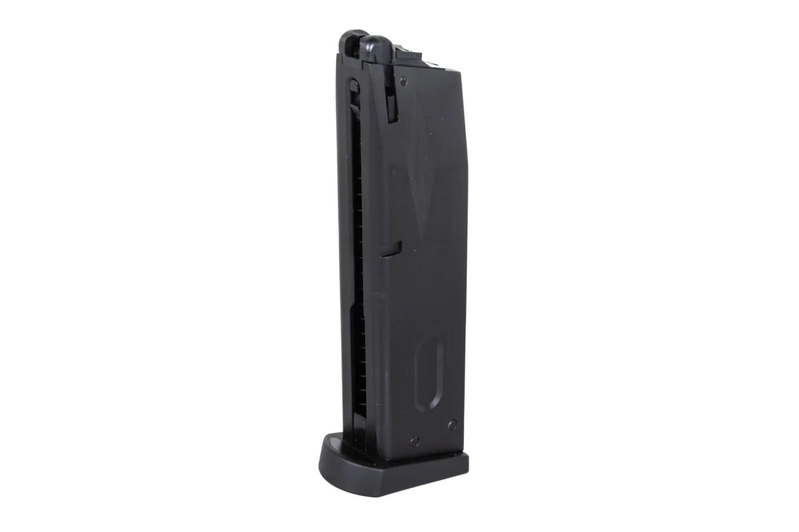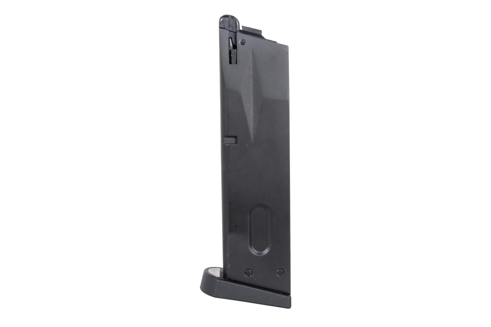 Wykonany z metalu (korpus) i tworzywa sztucznego (stopka, follower, szczęki), magazynek zasilany green gasem pomieści 24 kulki. Zaprojektowany został z myślą o replikach VM9 i pochodnych.