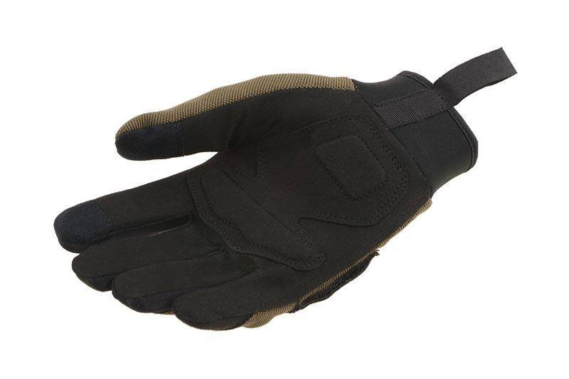 Na zakończeniach kciuka oraz palca wskazującego od wewnętrznej strony umieszczono antypoślizgowe panele, dzięki czemu w rękawicach bez problemu można obsługiwać dotykowe ekrany urządzeń takich jak smartfony czy tablety. Elastyczna dolna część rękawicy ułatwi dopasowanie do nadgarstka, od zewnętrznej strony umieszczono wygodne zapięcie z rzepem umożliwiające regulację obwodu oraz pętlę montażową pomagającą dotroczyć rękawice do oporządzenia.