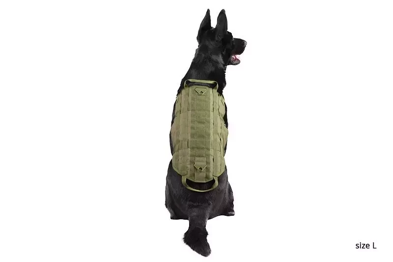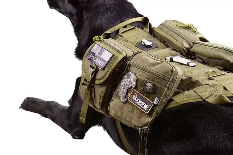 Przednia taśma została wyposażona w miękki rękaw / comfort pad. Kamizelka posiada 2 uchwyty do przytrzymania psa oraz 2 metalowe zaczepy do mocowania smyczy. Na grzbiecie, na całej długości umieszczono duży panel rzepa, a po bokach rzędy taśm systemu MOLLE / PALS, które umożliwiają montaż oraz dowolną konfigurację dodatkowych kieszeni i ładownic.