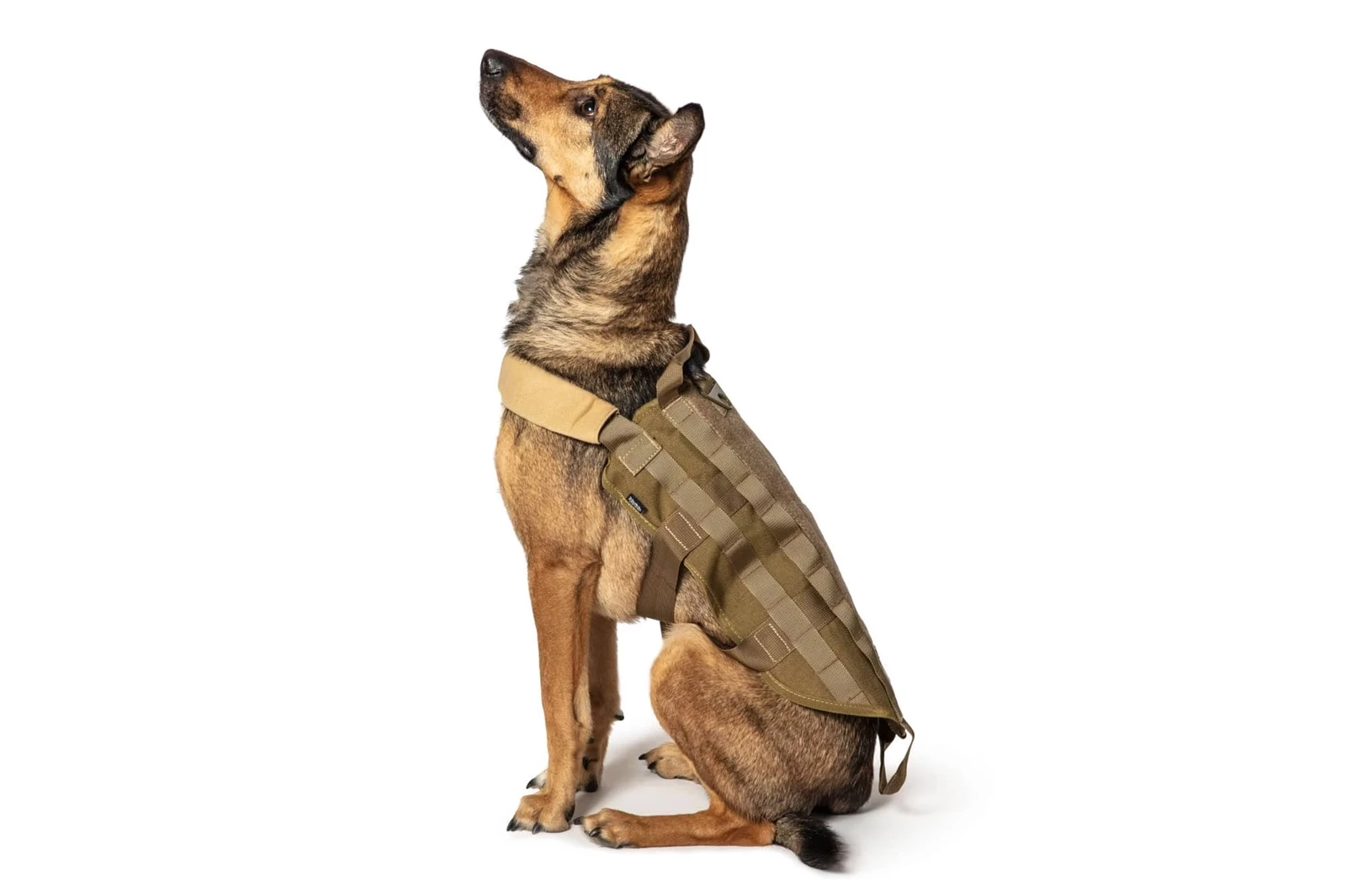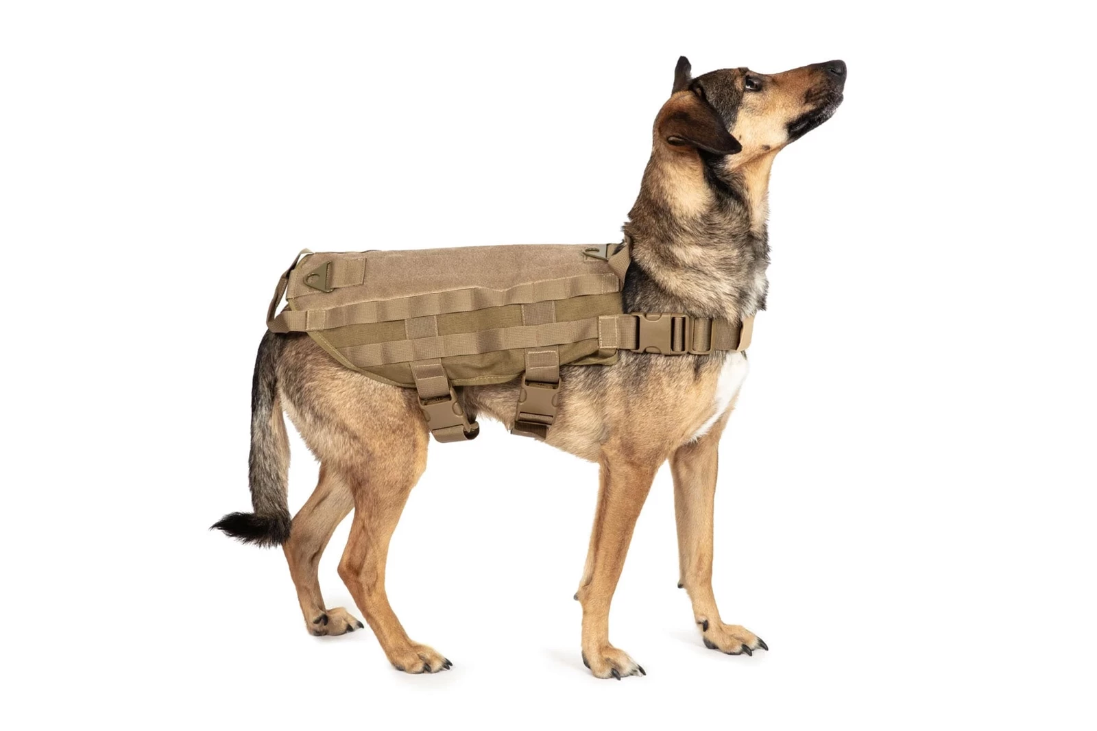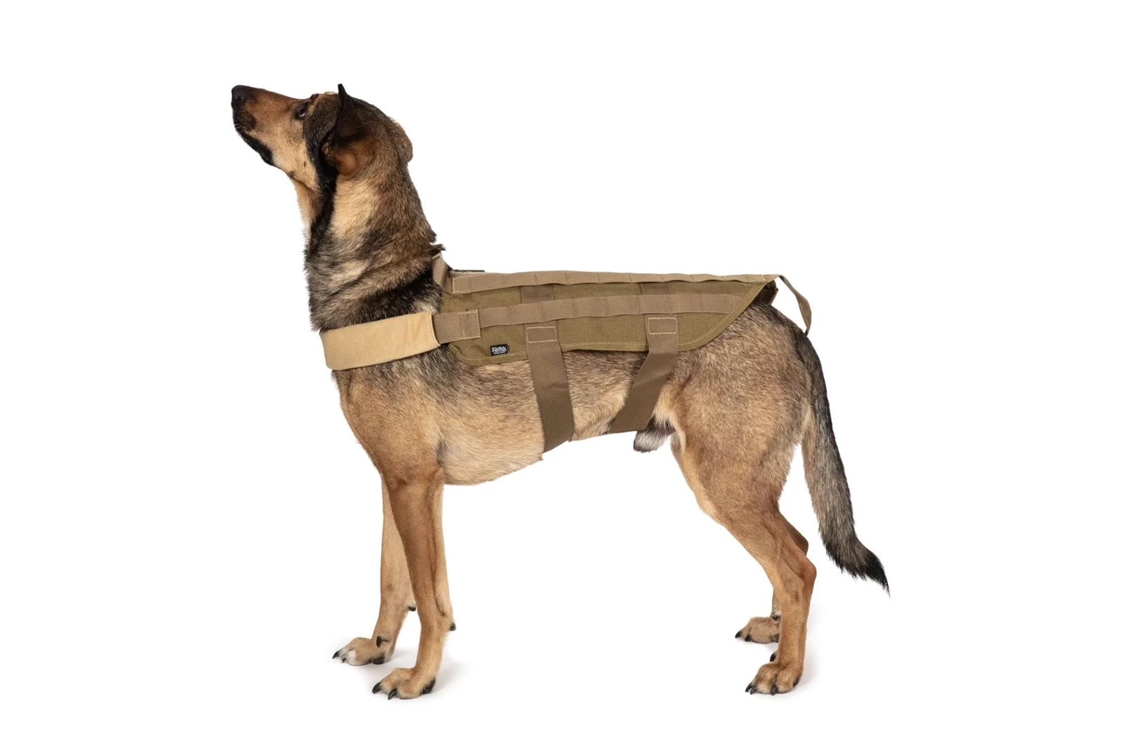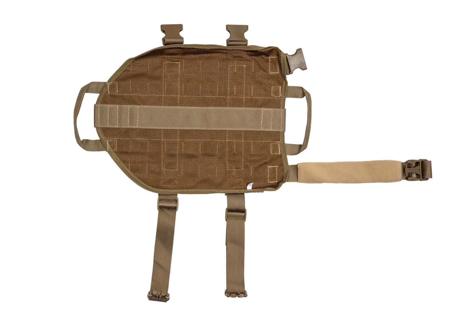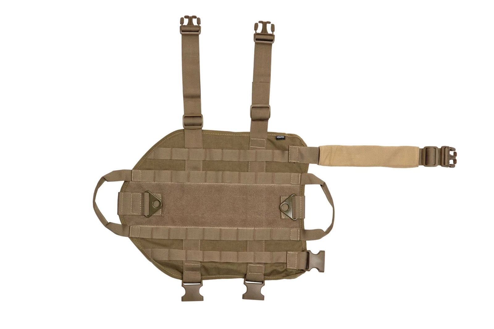 Przednia taśma została wyposażona w miękki rękaw / comfort pad. Kamizelka posiada 2 uchwyty do przytrzymania psa oraz 2 metalowe zaczepy do mocowania smyczy. Na grzbiecie, na całej długości umieszczono duży panel rzepa, a po bokach rzędy taśm systemu MOLLE / PALS, które umożliwiają montaż oraz dowolną konfigurację dodatkowych kieszeni i ładownic.