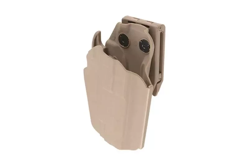 Wykonana z tworzywa sztucznego kabura na pas o szerokości od 40 do 60mm wyprodukowana prze firmę FMA. Dzięki specjalnemu systemowi docisku oraz wkładce dystansującej kabura jest kompatybilna z licznymi modelami broni krótkiej (m.in. GLOCK, XDM, CZ P09, SIG P226 i wiele więcej!). Posiada system blokady, który intuicyjnie jest zwalniany przy dobywaniu broni.