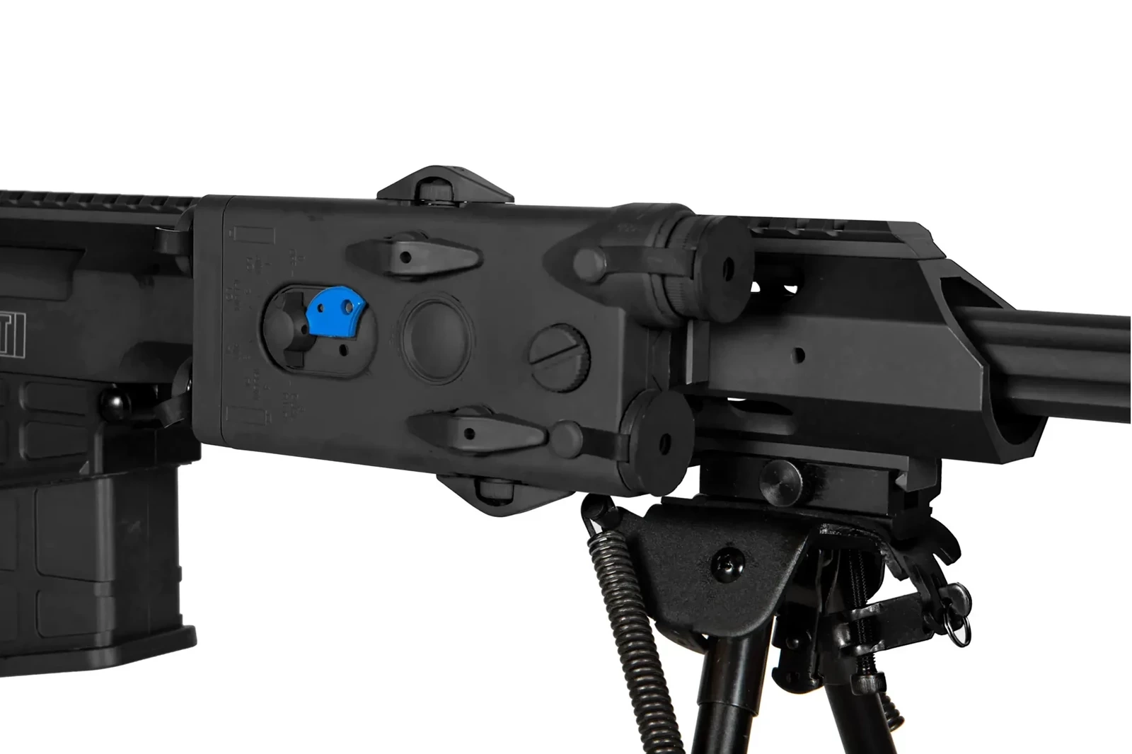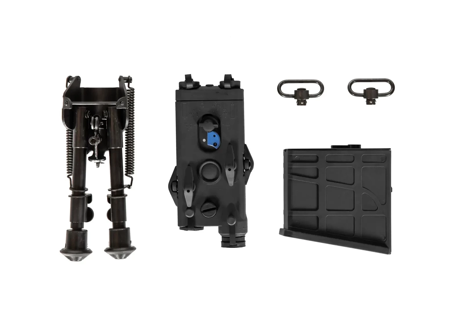 W zestawie znajdziemy również regulowany, składany bi-pod montowany na szynę RIS oraz atrapę puszki PEQ służącą za schowek na akumulator. Ponad to replika posiada 5 gniazd zawieszenia QD dla dowolnego rozmieszczenia zaczepów (2 ucha QD znalazły się w komplecie). 4 szyny RIS o różnej długości rozmieszczone wzdłuż frontu pozwolą na dowolną modyfikację karabinka.