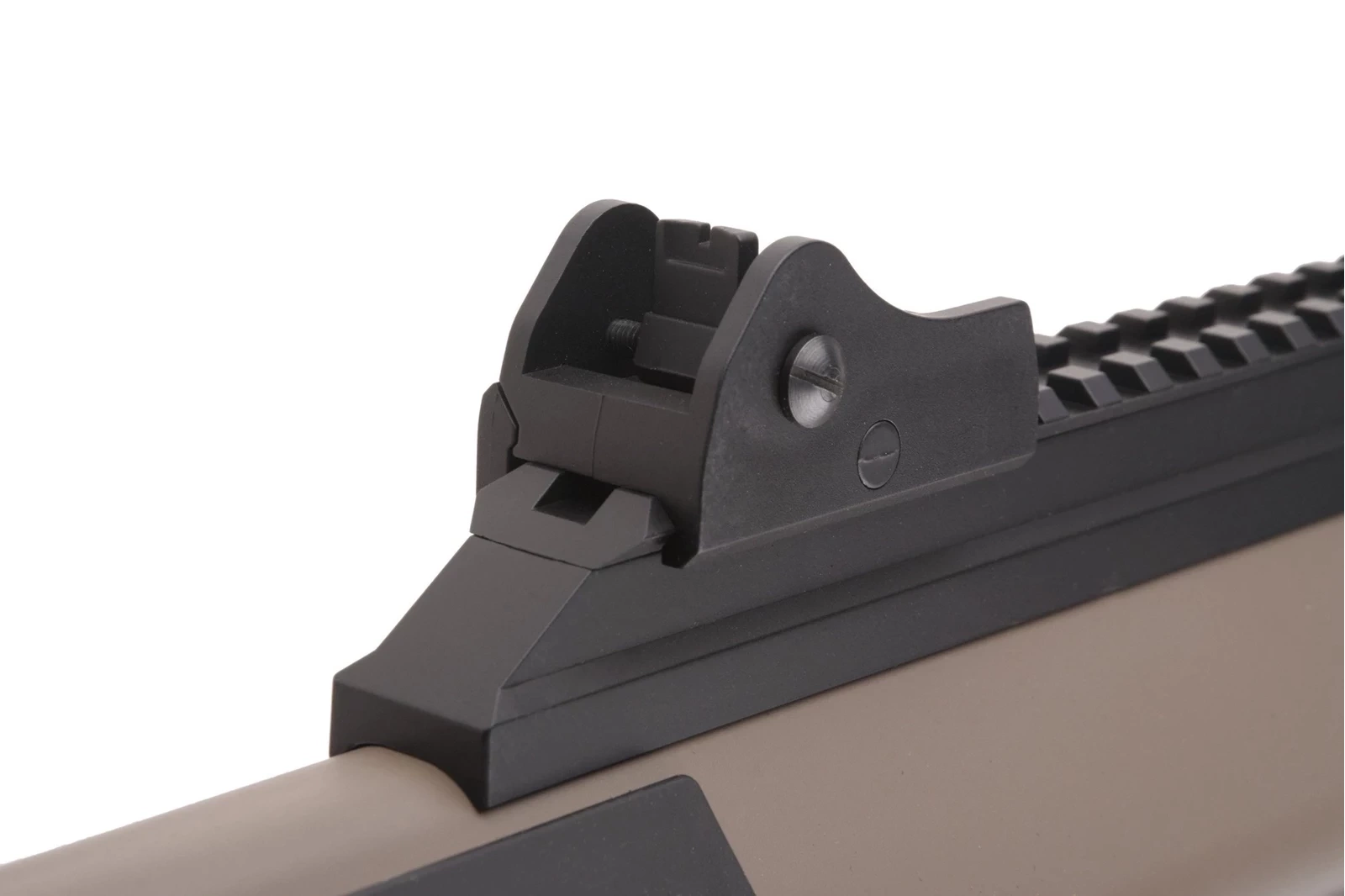 Zarówno w tylnej jak i przedniej części repliki znajdują się metalowe uchwyty do mocowania zawieszenia taktycznego. Dostęp do pokrętła regulacji systemu hop up uzyskujemy standardowo, po odciągnięciu rączki przeładowania i odsłonięcia tym samym okna wyrzutnika łusek. Rączkę można zablokować w tylnej pozycji. Co charakterystyczne dla tej konstrukcji okna wyrzutnika znajdują się po obu stronach dzięki czemu wygodny dostęp będzie miał też użytkownik leworęczny.  Tłumik płomienia został osadzony na 14mm, lewoskrętnym gwincie.