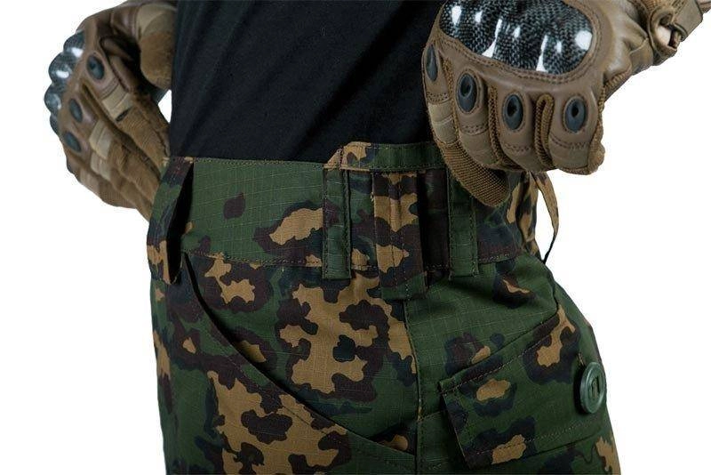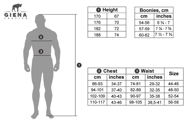 Wykonane z mocnego materiału w splocie Rip-Stop spodnie parka przez rosyjską firmę Giena Tactical. Spodnie w klasycznym kroju bojówekposiadają klasyczne kieszenie oraz duże kieszenie cargo na udach oraz pośladkach. Kieszenie zamykane są za pomocą dużych guzików typu kanadyjskiego. Kieszeń na udach dodatkowo posiada elastyczną linkę z regulatorem.